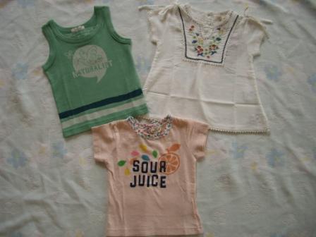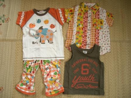 セラフ今期夏物が5枚も入った福袋がマリモさんより今夜21時~発売されますしかも、ほとんどが盛夏品番だそうです税込み5,250円(送料別)同時に今期夏物セラフのママ用も発売されますこちらは4枚入りで、税込み5,250円(送料別)同時にBit'zの今期夏物5枚入り福袋も発売ですこちらもほとんどが盛夏品番とのこと。税込み5,250円(送料別)で~す。まだまだ店頭にならんでる盛夏品番がなんと1枚1000円で買えちゃうなんて超お得~~参戦検討中デス週末に祖父が亡くなり、娘も連れてお通夜に行きました。ちゃんと娘の着替えも1組持参(当然のことですけど)「ちゃんとお母さんしてます」とアピールしようと思ってました。で、案の定娘ちゃんはズボンを汚してしまい「さて着替えさせようか・・・」とカバンを探ると、「あ・・・あれ?着替えが無い!!!」ちゃんとビニール袋に入れて準備しておいた着替えが見当たらない!車内に忘れたかと捜しても見当たらず・・・。約2時間、娘ちゃんは「Tシャツとオムツ」という恥ずかしい格好で過ごしましただぁぁぁぁぁ~~~~~~~翌日に祖父の家・私の家・車内を再び捜しましたが娘の服1セットは見つからずじまい。ハーフツリーのボーダーTとF.Oのブーツカットパンツ。「気に入ってたのに~~~~」さて、今夜のマリモさんにはこの事を理由に参戦しようかしら?立ち直りの早いワタクシです
