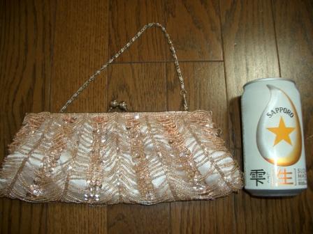来週は友人の結婚式で~~す。今まで何度も結婚式にお呼ばれしましたが、『真夏の結婚式』は初めてです。暑いだろうなぁ・・・・バッグがくたびれてきたので、バーゲンで物色していましたがパーティバッグってバーゲンにならないのね・・・しかし!ありました、ありました!楽天内に格安パーティバッグを扱うお店「おぉ!安い!!!」即GETしちゃいました~税込み3,885円でした~。ビーズが波のように縫い付けられてて、その下にはスパンコールもキラキラ色は思ったより「ピンク」っぽい「ピンクベージュ」でした。(下の画像では色が上手く出てません)チェーンはロング&ショート2本付きで、斜めがけもOKチェーンを外せばクラッチバッグとしても使えます。ストールがゴールドなので、バッグと良くマッチするかな大きさはこんな感じです。(このビール、今お気に入りなんです~←関係ないですが)思ったより高さがなかったので、お財布が入りません・・・・ハンカチ・デジカメ・口紅くらいでいっぱいになりそうですが、まぁ、パーティバッグは『飾り』みたいなものですよね~。別に紙バッグ持ちます。さすがビーズたっぷり、ちょっと重いかも。時間があれば。ワンピ・ストール・バッグをコーデして画像upしたいと思いま~す