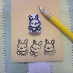 みかん(私の娘)が『ちびギャラ』っていうかわいい絵本を学校から借りてきた♪「消しゴムスタンプにしやすいキャラがのってるよ~」みかん・・・母と一緒ではまってるのかな・・・^^私が選んだ絵は 幸せウサギ♪絵本には、こう書いてある『幸せ探していいですか?うつむく貴方の笑顔のために』こんなウサギがいたら・・・みんなに幸せの種をまいてくれるのにな・・そんなことを思いながらも彫刻刀、デザインカッターと道具を揃えていざ、ホリホリ・・・結構細かい作業なので、大変・・・でも、時間も忘れて・・私が消しゴムスタンプはじめたの~って知合いに言ったらそれやって、何になるん?って聞かれた^^;;何になるわけでもないけど、とにかく楽しいの~♪♪書いて、彫って、スタンプして・・・・充実感がみなぎってくるんだわ!楽しい時を過ごすってしあわせやんね~♪まだまだ、未熟な作品だけど もっともっと作りたい♪この本をみてると消しゴムスタンプも生活のいろんなシーンで使えることがわかって楽しみがまた増えちゃった♪是非オススメの本です♪