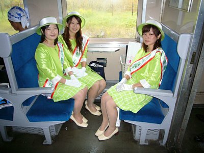引越し作業中のnotoshunです。9代目「大船渡つばき娘」のお二方をご紹介した20日の日記に「娘さん? 娘というよりは・・・・「お〇チャン」に見える。(2008/03/21 04:10:02 PM)」と言うコメントを頂戴しました。もし、そのように見えたとしたら、私の携帯電話のカメラ機能の能力不足、あるいは、私の技量不足です。実物は美しいお嬢さんでした。彼女らの名誉のために、画像を載せて置きます。なお、彼女らは、大船渡市役所の委嘱を受けて準公務員として活動中ですので肖像権はないと考えていますが、彼女ら二人以外については肖像権を考慮せざるを得ません。大変失礼ながら顔面を塗りつぶさせて頂きました。一ノ関駅での花束贈呈であります。一関市観光協会(あ、漢字表記はこれで正しいのです、一関市と一ノ関駅なのです)から大船渡市への花束贈呈でして、彼女らは受け取る側なのでした。列車進入直前の記念撮影タイムであります。9代目「大船渡つばき娘」の抱負を引用しておきます。大船渡市広報からの引用です。左:紺野由美子さん(29歳・赤崎町)美しい海と山に囲まれた自然豊かな椿の里・大船渡のPR活動に努めていきたいと思います。右:山口幸恵さん(29歳・盛町)おいしい特産物や素晴らしい工芸品など、魅力あふれる大船渡を広くPRしていきたいです。車内では、「大船渡つばき娘」のお二人から乗客代表への花束贈呈が行われました。この画像は花束贈呈直後の記念撮影タイムであります。誠に失礼ながら、乗客代表は公務中の準公務員ではありませんので、失礼ながらお顔を塗りつぶさせて頂きました。お許しください。車内での配りモノでございます。わかめを頂きました。盛駅到着後でございます。大船渡市観光協会の職員さんにも入っていただきミニ撮影会にしてしまいました(この日は久しぶりに乗り鉄ポートレーター隊が集合していたのです)。最後の画像は、盛駅での撮影分です。三陸鉄道のマスコット「さんてつくん」に加え、NREの販売員にも入って貰いミニ撮影会にしてみました。NRE販売員さんのお顔は塗りつぶさせていただきました。すみません。以上です。言いたかったことは、大船渡つばき娘のお二方は美しい娘さんである、と言うことです。これ以外の主張はございません。はい。