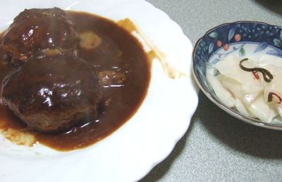 お弁当画像を見てどうしても食べたくというか、作りたくなったハンバーグ。焼くのは難しいし、苦手なので煮込みハンバーグにしました。奥さんのススメで、豆腐ハンバーグに。 柔らかくて美味しくできました。ただ、失敗が二つ。柔らかすぎてました。牛乳が多く、パン粉が少なく、豆腐が多かった。(水切り忘れたし)作り過ぎました。400グラムぐらい作りました。出来たのは8個。どうしょう?明日の弁当は決まりだな(笑)もう一品は蕪の三杯酢。今が旬。箸休めにピッタリ。所要時間、1時間。久しぶりに料理をした気分です。