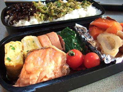 昨日は、寝たのは3時前。で、朝は6時起き。なので今日の弁当はありません。昨日アップ出来なかったお弁当です。塩鮭。野菜の煮物(人参、レンコン、里芋、竹輪)。ホウレン草のお浸し。ベビーハム(何故か大好物)。プチトマト。大根葉の佃煮。今は眠気がとんだ状態だけど、いつ睡魔が襲って・・・すいません・・・ベタギャクさあ、晩ご飯は何食べよう?まだ、野菜がいっぱいあるからメインは野菜だな。