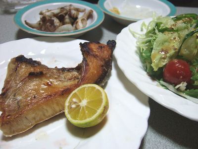 昨日の晩ご飯は、久しぶりの焼き魚。以前、秋刀魚の塩焼きを作って以来かな。あの時は、フライパンで作りました。その後、弁当用に塩鮭を焼くのに、ガス台のグリルの使用を解禁しました。で、スーパーで発見した「ブリカマ」グリルを使って、ブリカマの塩焼きに。酢橘をぎゅっと搾って・・・・脂がのって美味しい。最近定番の野菜サラダ。ドレッシングは、粒マスタードとオリーブオイル、塩、胡椒、酢橘のドレッシング。マスタードソース?適当に作ったので、名前は判りませんが上出来の味。他には、ハリイカの刺身とゲソの塩胡椒炒め。ホウレン草のお浸し。さあ、今日は遅めの休日出勤。って、本当に遅くなった(汗)明日も休日出勤の予定・・・出勤するなら休日じゃないってか。