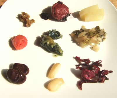 のんびりの一日。予定以外にも、スーパーや産直市での買い物(5,000円分も買ってしまった)図書館に行き本を4冊借りてきて、読んでいるうちにうたた寝。あぶない、あぶない。風邪を引くところでした。今朝のご飯は、冷蔵庫に入っている「常備菜」と新米。お麩と春菊の味噌汁。漬物大好きな私、これさえあれば何杯でも食べられます。(って、実際には、盛り切りの1膳に決めてるから何杯も食べないけど) 左上から、 金山寺味噌 海苔 梅干 沢庵 辛子明太子 茄子の辛子漬け スグキ菜漬け 醤油豆 らっきょう漬け 柴漬けキクラゲ 他には、ちりめんじゃこ、蕪の浅漬け、味付け海苔があるけど、さすがにそんなには食べられない。自家製は、梅干と茄子の辛子漬け、らっきょう、蕪の浅漬けです。さあ、今から晩ご飯を作って、TVかDVDでも見ながら食べよう。(ちょっと寂しい)何食べようかな?って、買い物したぐらいだからメニューは決まっていますが(笑)明日、アップします。