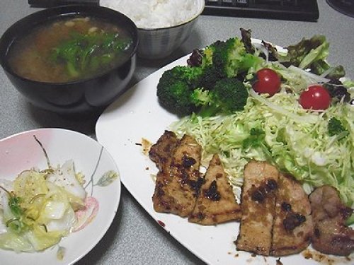 今夜と言いながら、実は昨日です。昨日の夜は、休肝日にしたので珍しくお米のある晩ご飯。メインは、豚のしょうが焼きステーキ。2種類のしょうが焼きです。右の方は普通のしょうが焼き。左はカレー風味のしょうが焼き豚肉は塩麹に漬けたもので、塩麹を洗い流してフライパンで両面をしっかり焼き、カット。醤油、酒、生姜、砂糖、味醂で作ったタレで半分を焼き絡める。もう半分には、カレー粉を入れたタレで焼き絡める。カレー風味のしょうが焼きは、「ごはんですよ~!!」のゆりりんさんのレシピから。もう少しカレー粉の量を増やせばよかったかな。付け合せの野菜は、キャベツ、レタス、胡瓜、トマト、玉ねぎ。ブロッコリーえのきと菜花の味噌汁白菜の漬物 ポチッとお願いします。 ドラえもんのタイム風呂敷のおバカな日記に受けていただきありがとうございます。うちの奥さんからも「久しぶりのヒット。笑えた」とのメールが来ました。ちょっと嬉しい。また、明日からも頑張って?ネタを探して更新していきます。で、今日も飲み会(笑)来週も数回の飲み会が予定されています。何より肝臓と財布が心配です。