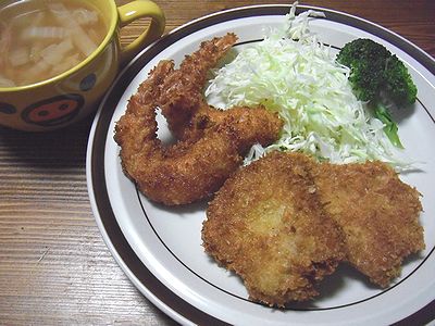 実家での晩ご飯。ヒレカツとエビフライの盛り合わせ。実際には、大皿にどーんと持って各自が好きなだけ取って食べるので、これは写真用(笑)ヒレカツは柔らかくて美味しい。海老はプリプリ。尻尾を残したら、奥さんが「ここが美味しいのに」と取っていきました。黄色い鳥のスープカップは、白菜とベーコンのコンソメスープ。 ポチッとお願いします。 昨日の引っ越しでほとんどの荷物を運び、残っているのは布団とホットカーペット、PCぐらい。迷ったけど、炊事道具も全部片付けました。週末までは今の職場だから、実家から通うか、向こうで弁当やうどんで過ごすことになりそう。ということで、しばらくまともなご飯はアップできないかもしれません。グリーンジャンボの結果を調べました。奥さんに頼んで大阪で買ってきてもらいましたが、20枚を二人で分けました・・・私が選んで残りは奥さん・・・奥さんのには、3000円が当たっていた。私は300円のみ。「ほら、残り物には福があるやろ」と勝ち誇ったような奥さんのセリフ。なら、5億円当ててくれよ・・・・・( ̄。 ̄ )ボソ...