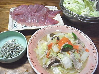 実家での晩ご飯。二女と奥さんのリクエストの八宝菜。 大きな中華鍋にいっぱい作って、次の日にインスタントのちゃんぽんにかけて食べるらしい。小女子は、レモンの絞り汁と醤油(辛子醤油の人もいるけど。私はポン酢派)ビンナガマグロの刺身(ビンチョウとも言います。学名はビンナガ、市場ではビンチョウ)片身で480円。美味しかったので全部食べた。八宝菜は残したけど、食べ過ぎだ。親戚のおじさんがくれたブロッコリー。巨大すぎる・・・二女の髪をのぞいた顔の部分と同じ大きさ。レモンや卵と比べてみました。 ポチッとお願いします。 長男が、生まれて初めてコンパに行ったらしい。奥さん「ええ子いた?付き合うような子は?」長男 「いない。コンパに行ったというだけ」何でも、長男の会社の先輩がセッティングしたらしい。そんなことをせずに、先輩たちに「彼氏のいない二女」を紹介してやれよ~!!と思う父であった・・・・・( ̄。 ̄ )ボソ... これは奥さんも大きくうなずいた(笑)