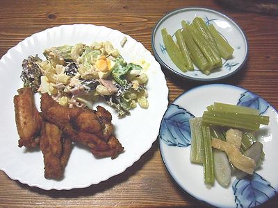 昨日の夜は、久しぶりに揚げ物。鶏のから揚げです。鶏のから揚げ(手羽元と手羽中) 我が家の人気は、手羽中、手羽元、もも・・・・胸肉です。奥さんこだわりのマカロニサラダ 材料の必需品:マカロニ、胡瓜、レタス、りんご、ゆで卵、ハム、シーチキン。 このどれ一つ欠けても駄目だそう。作り方では、 胡瓜は、塩もみしない。(ポテサラは塩もみするのに、なぜ?)葉ごぼうの炒め煮物 葉ごぼうは、軸を食べるもので、普通のごぼうの若いものとは違います。 根と軸は水にさらしてあく抜きしたあと、さっと茹でてサラダ油でいためます。 だし、醤油、味醂、砂糖で油揚げと一緒に煮ます。 春の息吹を感じるごぼうのやさしい香りが美味しいです。蕗の青煮 ポチッとお願いします。 昨日の夜は長男も帰宅。今朝は、久しぶりに家族が一部屋に集合。ちょっと狭いぞ・・・長女から「いいものを見せてあげる」と言われて「siri」の機能を紹介された。音声認識でメールやスケジュール管理が出来るもので、便利ですね。クラウドシステム、siri、グーグルリーダー・・・色んな技術が開発されています。うかうかしていたらIT社会に取り残されるかも。そろそろ4年使ったガラケーをやめて、スマホに変えるべきかな。