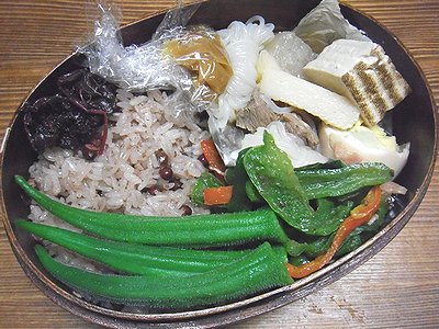 今日の弁当は、実家で作ったので詰めただけ。赤飯とおでんの弁当だから赤飯おでん弁当(ってそのままやん・・・)赤飯は、井村屋の赤飯の素で作りました。これ、便利で美味しいんですよね。おでんは、昨日の晩ご飯の残り。(玉子、大根、すじ肉、天ぷら、しらたき、焼き豆腐、がんもどき)茹でオクラピーマンとベーコンの炒め物 ポチッとお願いします。 奥さんは無事に戻ってきました。というか、夕方には晴れ間が見えて、40分のジョギングに行けたぐらい。本当に後ろ髪を引かれる思い・・・猫たち可愛すぎる。二匹を出してやるとすぐに取っ組み合い。首投げ、一本背負い。猫キック、猫パンチ、甘噛み・・・本当に甘噛みか?見ていて飽きません。1匹じゃなく2匹もらってよかった。