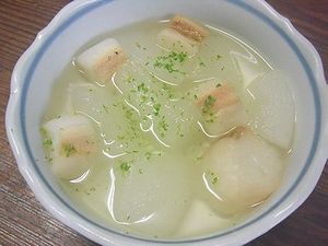 【レシピブログの白だしを使った「ホメられ料理」レシピコンテスト参加中】 割烹白だしの料理レシピ冬瓜と麩の白だし汁(ネーミングがイマイチ・・・・・( ̄。 ̄ )ボソ...)【材料】2人前・姫冬瓜 5cm (普通の冬瓜3cm分)・麩 10個・水 500cc・ヤマキの白だし 大2・酢橘 1個(柚子、小口のネギでもよい)【作り方】1 冬瓜は一口大の大きさに切る。麩は、分量外の水で戻しておく。2 鍋に水を入れ冬瓜入れて蓋をして柔らかくなるまで煮る。3 白だしと麩を入れて、弱火で1分煮る。4 器に汁と一緒に入れて、酢橘の皮をすりおろして飾る。(柚子、ネギでもよい) 冬瓜は、利尿作用があってむくみに効くそう。成分の溶けだした汁も一緒に飲みます。汁をたっぷり吸った麩が美味しい。冬瓜はとろけて、白だしの美味しい汁がじわ~。昨日の晩ご飯は、カンパチの刺身と鰹のたたきがメイン本当は、鰹のたたきだけのつもりが、母からカンパチの刺身をもらったので、豪華になった。イカの煮付けキャベツのコールスローサラダ明太子 ポチッとお願いします。 今日は、午前中は家庭菜園で冬野菜の作業。今から、にゃんこの風呂です。嫌がらないかな?猫まっしぐら・・・というコマーシャルが昔ありましたが、試してみました。私の声がちょっと入っています。モラタメで試すで、キャットフード「猫の王国 アロマブレンド」を使いました。ドライフードの上に少しだけおかずとして乗せました。気に行ったみたいです。
