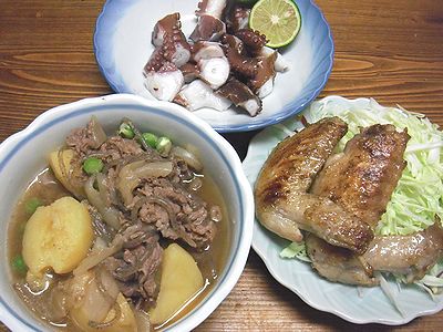 昨日の晩ご飯は、肉じゃががメイン?手羽先の塩胡椒焼きかな?長男が、帰ってきていたので好物の肉じゃがを作りました。奥さん流は、糸こんにゃくが入るのと、玉ねぎたっぷりが特徴でしょうか。長男曰く「これは自慢してもいいよ。お母さんの肉じゃがは今まで食べたどこのものより美味しい」奥さん「うれしいことを言ってくれるなあ。(T-T) ウルウル」と大喜び手羽先の塩胡椒焼きは、さっと茹でてから皮に焦げ目が付くように焼きました。たこぶつは、酢橘を搾った醤油で。ワサビや生姜醤油で食べるよりも絶対に酢橘!たこの甘さが引き立ちます。 ポチッとお願いします。 クイズでコンピュータが人間に買ったとのニュースIPS細胞から卵子や精子が出来るとのニュース進歩か神の領域への挑戦か?コンピュータは、映画の「ターミネーター」や竹宮恵子の漫画「地球へ」を思い出す。IPS細胞は、映画「アイランド」の設定を思い出す。本当にこのまま進んでいいのかな?と、難しいことは置いといて、二女とにゃんこが一緒に眠っています。名付けて「お姉ちゃんと一緒」・・・二女はスッピン顔出し(許可済み)