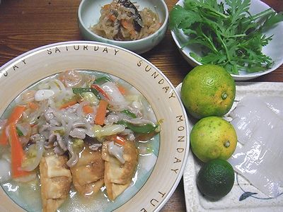 今日もいい天気。朝は家庭菜園でほうれん草の収穫と草抜き。2時間みっしり働いたので腰が痛い。昨日の晩ご飯は、奥さんと二女のリクエストの八宝菜。ちょっとアレンジして「揚げ餃子の八宝菜かけ」にしました。いかの刺身。漁港近くのスーパーに行くと、小さいイカが5杯で210円。2杯を刺身にして、残りは八宝菜に。ゲソは肝と一緒に煮付けにしました。切干大根は、去年作ったものを冷蔵庫に保存していたもの。今年のが取れる前に食べなきゃ。春菊は生でサラダに。昨日徳島で買ってきた酢橘は、無農薬だけど巨大。比べるために、奥さんがもらってきた大きいものと普通に店で売っているサイズと並べました。 ポチッとお願いします。 奥さんと長女は、宝塚の全国ツアー高松公演に行きました。私も夕方の公演を見に行きます。(奥さんたちは午後の公演、夕方と2回見ます。)今日のにゃんずは、「出してよ~と鳴くにゃんず」朝とかに部屋(段ボールハウス)の横を通ると、可愛い声で「にゃあにゃあ」鳴きます。