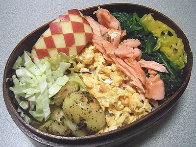 今日の弁当は、久しぶりの三色丼弁当・・・弁当に丼というのも変だけど、三色というのも変かなと丼と名乗る。そぼろを作ろうかと思ったけど、安かった塩鮭をほぐして、「焼き鮭の三色丼弁当」です。焼き鮭玉子そぼろほうれん草のお浸し沢庵漬けって、四色じゃないか・・・・・( ̄。 ̄ )ボソ...茹でじゃがいものハーブソルト焼き+バジルキャベツの塩昆布和えクロアチアりんご ポチッとお願いします。 奥さんから久しぶりに連絡が来て「変な荷物が届いている。どうもエプロンらしい」とのこと。調べてもモラタメもモニプラでもない。で、ずっと考えていたら、レシピブログでそんな企画があった気がする。週末に帰ったらみてみよう。もし、そうならエプロンして写真を撮って公開するか(笑)