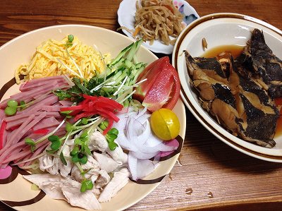 昨日の晩御飯は、冷麺とヒラメの煮つけ。冷麺(冷やし中華) 具が、多すぎて麺が見えない。 茹でささみ、ハム、錦糸卵、胡瓜、赤玉ねぎ、トマト、カイワレ大根、青紫蘇ヒラメの煮つけ切り干し大根煮酒の肴用には、ブリの刺身や冷奴(写っていないので目を皿のようにしてもわかりません) ポチッとお願いします。 自分の食事が終わった奥さん。私が、お酒を飲んでいる横で、いきなり立ち上がり「そうや、今から断食や!」長女「いや、いや、今、お腹いっぱい食べたやろ」奥さん「断捨離の間違い」台所の水屋の中を整理していた我が家今度は、食材保管庫です。高さ2メートルぐらいで幅が60cmに扉にも物が入るタイプカレーや乾物、砂糖や塩、色んなものを次から次へと詰め込んでビッチリ。賞味期限切れのものが、奥からわんさか出てきました。ビフォー、アフターの写真をとればよかった。アフターは取れるけどビフォーがないとね。