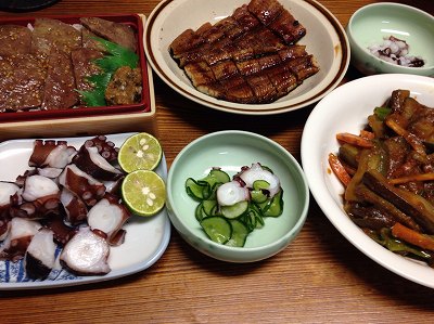 昨日は、土用丑の日ということで、全国的に一番多いであろうメニューでした。私、奥さん、長女と彼氏、二女と彼氏という6人でワイワイ言いながらの晩御飯ウナギかば焼き重。厚切り牛タン重。牛カルビ重の3種類をそれぞれ私は飲むので(おい!節酒じゃなかったのか!!)うなぎかば焼き。タコの刺身 タコは、二女の彼氏が昼間に釣ってきた地ダコこの時期のたこは、土用だこと呼ばれ親に食べさせるなという諺があるぐらい美味しい。スダチ醤油で食べるのが我が家の食べ方。たこの甘みが引き立ちます。 生きていたので写真には入っていないけど、1本分を生の刺身にしました。麻婆茄子 ポチッとお願いします。 錦織選手が、マスターズ大会決勝進出今度こそ、マスターズ初優勝を成し遂げてほしい。今でも一流のプレーヤーだとは思うけど、歴史に名前を残してほしい。