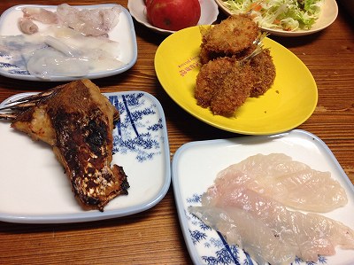 実家に帰ると魚料理が続きます。理由は、魚の行商人から母が大量に魚を買っているからです。昨日の夜のメニュー。アイナメの刺身鯛の味噌漬け(先日の二女彼からもらったもの)小イカの刺身豆鯵のフライ(これが、このシーズン一番のご馳走。これから何度登場するか)トマトスライスサラダ実家の庭のゴーヤの収穫が本格化しました。今日の収穫は4本緑のカーテンも立派になりました。ただ・・・畑にもこの倍の規模のゴーヤが植えられていること。祭りが怖い・・・ ポチッとお願いします。 今日も明日の49日法要の準備で大忙し。明日も訪問できないと思いますがご容赦ください。