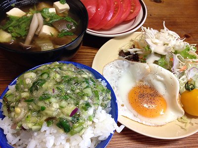 昨日は飲み会。今朝はいつもの時間に布団から抜け出せなかったので手抜きのカレー炒飯弁当朝ごはんは、今シーズン初めて作った「だし」を乗せたぶっかけ蕎麦週末なので残しても傷めるだけなので、全部乗せました。だしは、茄子、胡瓜、青紫蘇、しょうが、茗荷です。 ポチッとお願いします。