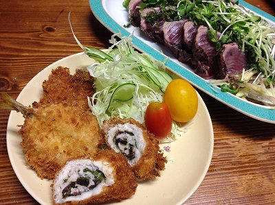 昨日の晩御飯は、フライ3種と鰹のたたき一番人気は、ささみの梅紫蘇巻きフライでした。観音開きにしたささみに、軽く塩胡椒をして青紫蘇と梅肉を乗せて、くるくると巻いて楊枝で止める。あとは、普通に小麦粉、卵をしてパン粉をつけて揚げます。梅肉は、梅干しと紫蘇を刻んですり鉢で滑らかにしました。豆鯵のフライ鰹カツ 鰹がかなり大きかったので4切れ分をカツにしました。鰹のたたき 青紫蘇とカイワレ大根をたっぷり。新生姜とポン酢で食べました。 ポチッとお願いします。 3連休の中日。今日は、奥さん、長女と一緒に宝塚へ月組トップスターの退団公演でした。久しぶりの宝塚でしたが、実は来週も行きます。来週は、人生初の生「エリザベート」観劇です。