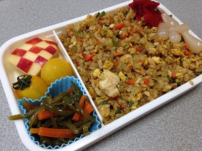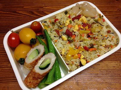 昨日の夜は、宝塚から戻ってお好み焼きを食べに行ったので、ご飯が少し余りました。残りご飯を使って、炒飯弁当。高菜と梅干しで味付けした炒飯です。他の具は、人参、玉ねぎ、ピーマン、パプリカ、炒り卵味付きご飯なので、おかずはあっさり。というか野菜です。茹でオクラ竹輪胡瓜ミニトマト ポチッとお願いします。 今日も朝更新できなかった。明日は、無理やり朝更新に変えます。