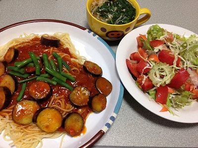 昨日の夜は、実家でスズキの刺身と小イカの刺身、きゅうりもみなどでした。写真を撮らなかったので、先日の検診前日の休肝日の晩御飯を久しぶりにミートソーススパゲティにしました。実家の茄子も入れています。サラダ(トマト、キャベツ、ミックスレタス、ゴーヤ、人参)ゴーヤは、種、綿をくりぬいてスライサーで薄くして水にさらします。苦みもなくなってこれが一番食べやすいかも。モロヘイヤとしめじのスープ ポチッとお願いします。 木曜の夜は飲み会でしたが、やってしまいました。クーラーを一晩中つけたままで眠ったのですが、一度も自動停止することなくフル回転だからうるさいこと。で、朝目覚めて玄関に行くとドアが10cmほど開いたままでした。どうりで自動停止しないはずです。冷えた空気は戸外に流れているんですから。ワンルーム+廊下に面して台所、反対にバス、トイレのウナギの寝床のような構造のアパート帰宅して余りにも暑いので、窓を開け、玄関の戸も少し開けて扇風機で熱気を出していました。で、そろそろいいかなと、窓を閉めてクーラーのスイッチを入れたのですが、玄関のことは失念していました。で、一晩中、フル回転だったという訳です。来月の電気代の請求が恐ろしい。