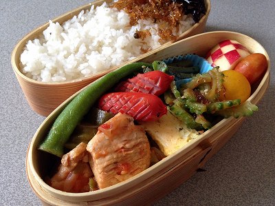 豚肉のスイチリ炒め弁当豚肉と玉葱を炒めて、塩胡椒、スイートチリソース、ケチャップで味付けしています。たれにブロック用(しみだし防止)にキャベツとゴーヤのスライスだし巻き卵ズッキーニのベーコン巻きオクラの胡麻和え蒲鉾の梅紫蘇挟みミニトマトクロアチアりんご梅干し ポチッとお願いします。 実家で祭り状態になっているゴーヤ。職場の同僚に差し上げたけど、まだまだ残っている。生や炒めて食べるのも限界があるし、昨年、作った佃煮はまだ冷凍室に残っている。今年は、干しゴーヤを作ってみました。種も一緒に干して、煎るとお茶になるそうですが、多分飲まないので、種は取り除いた。2、3日でカラカラに乾いたので野菜室で保存。生がなくなったら戻して使ってみよう。佃煮はそれからでもいいかな。