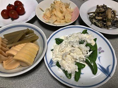 地味な野菜中心の晩御飯です。地味すぎか。メインは、筍ですね。筍の煮物と蕗の煮物スナップえんどうの新玉マヨネーズ掛け 粗みじんに切った新玉ねぎをマヨネーズ、レモン汁、黒胡椒で和えたものを掛けました。わらびの卵とじ筍の姫皮の酢味噌和えミニトマト ポチッとお願いします。 穂先筍が沢山あるので、干し筍(乾燥筍)を作ってみました。室外で1日、室内で1日(雨だったので)干したのがこれ。いい感じで干せています。あと、1日外で干せば完成かな?筍のシーズンが終わったら調理してみます。