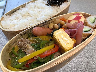 パプリカが安かったの購入。買い置きのピーマンと冷凍の牛肉でオイスターソース炒めにカラフル・チンジャオロースと名付けたけど、そもそも青椒肉絲は漢字の通り青のピーマンの細切りパプリカを使うと赤青黄椒肉絲となるか。信号機か!!(いわゆるノリツッコミです)だし巻き卵ウィンナー煮豆茗荷の皮の甘酢漬け竹輪胡瓜クロアチアりんご昆布の佃煮 ポチッとお願いします。 久しぶりににゃんこ写真お母さんの枕の上でくつろぐきなこ。朝イチ、奥さんが布団から出た時はここにポジショニング右肩をだして、遠山の金さんが桜吹雪を見せているように思うのは私だけ?