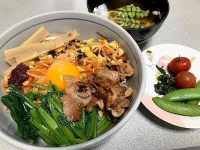最近、はまっているビビンバ丼岐阜県にあるカネカ食品の「ビビンバもやし」を使って作る簡単ビビンバ丼です。温かいご飯に乗せるだけでできるけど、今回は甘辛く焼いた豚肉と小松菜のお浸し、手作りメンマ、卵黄を乗せて、コチュジャンをたっぷり小松菜は、ポン酢醤油に浸しています。スナップエンドウミニトマト蕪の浅漬けとろろ昆布とえのき茸の吸い物 ポチッとお願いします。 やっと週末でも、今週末はあまりのんびりできない。明日は、父のむかわれ(1周忌)の法要です。母から「心肺停止で救急車で運ばれた」と電話があったときは本当に驚いた。みんなで父の懐かしい思い出話をしましょう。