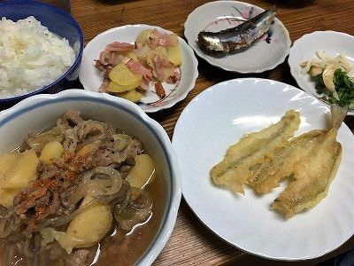 昨日の晩御飯は、長男夫婦と二女彼が一緒(理由はあとで)メニューは、長男にとってのおふくろの味。肉じゃががメイン家庭菜園のじゃがいも(北あかり)を試し堀りした初物のじゃがいもを使用サブのメインは、釣り立てのキスの天ぷら他には、じゃがいもとベーコンの塩胡椒炒め鰯の煮物蕪の浅漬け休肝日にしたので、白ご飯長男夫婦は釣りの名人である二女彼に頼んでキス釣りを教えてもらっていました。釣果はいまいちだったようですが、もしものためにと合流前に二女彼が釣っていたキスで天ぷらを揚げたてはさっくりふんわりで美味しい。弁当は、肉じゃがをもらってきたので肉じゃががメインです。だし巻き卵ウィンナー小松菜と油揚げのお浸しミニトマト竹輪キュウリクロアチアりんご梅干し ポチッとお願いします。
