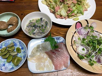 昨日の晩御飯は、刺身2種盛と朝釣り鰯の酢味噌和えがメイン刺身は、前日に昆布〆にしたヒラメとサワラの刺身鰯の酢味噌和えは、二女彼が早朝に釣ってきたものを使用カワハギの真子の煮つけソラマメキャベツと魚肉ソーセージの塩胡椒炒め赤玉ねぎのサラダみんなの食事のメインは、ラーメンでした。豚骨、醤油とんこつ、鶏ガラ塩、鶏ガラ醤油とバラバラ私は、検診も終わって油断して、普段食べない飲んだ後のラーメンを食べてしまいました。反省日曜のお昼ご飯は、この時期定番の淡竹うどんうちの奥さんは、冬のしっぽくうどんと5月の淡竹うどんのどちらも甲乙つけがたい好物で3、4日続いても平気。というか食べたいそうです。 ポチッとお願いします。 昨日の夜のボクシング勝って防衛した人、新チャンピオンになった人もいますが、話題は不可解判定で負けた村田選手のこと是非、再挑戦してチャンピオンになってもらいたいものです。