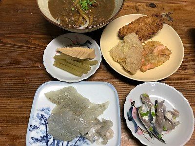 昨日の晩御飯は、家にあるものだけで作ったメニューで、あらためて自分で買ったものゼロと言っても平目は、母が買っていたものですが、魚の行商の人からなので新鮮で安い。平目の刺身イワシの酢味噌和え(イワシは釣りたてを二女彼からもらった)筍の天ぷら小エビのかき揚げ(小エビは冷凍していたもの)イワシのフライ(二女彼)蕗の煮物と筍の煮物カレーうどん このGW期間中、奥さんはカレーかうどんばかりを食べていました。 で、とうとう二つが合体して、かれーうどんに ポチッとお願いします。 どこにも行かないゴールデンウィークだけど、ちょっとしたイベントはあります。第1弾は、先日のプチ同窓会という名の飲み会第2弾は、今晩行うファミリー恒例のBBQ。いや、焼きパー?まあ、どっちでもいいか。総勢15人?数日前から雨予報で心配してたけど、どうやら大丈夫のようです。まあ、晴れ晴れ夫婦がやりますから。