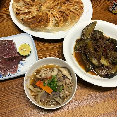 長男夫婦も沖縄から無事に戻ってきました。風が強かったのでダイビングはできなかったのが残念だったけど、他は結構楽しめたよう。まあ、この台風の中で行けただけでも奇跡ですから晩御飯は、二女と二女彼も入れて豚汁がメインに餃子など私は、餃子は具をつまみにして飲みます。戻り鰹の刺身茄子の肉みそ炒め。(これが絶賛の味でした) ポチッとお願いします。 ご心配をおかけしました家庭菜園の様子ですが直撃コースだったものの、短時間だったので、まだ恵みの雨レベルかと思っていましたが・・・残念ながらほぼ終了です。オクラ、ゴーヤは倒壊。茄子も収穫したものでどうやら終了ピーマンとモロヘイヤは何とか収穫できましたが、これもほぼ終わりかな。残りは、つる首南瓜が収穫できるかどうかでしょうか。里芋も倒れているので収穫できるかどうか?で、水田の地上げをして畑に変えるという、畑の移転作業を進めていますが業者さんが一向に進めてくれず、秋冬野菜の種まきが遅れています。今年の冬はだめかも。