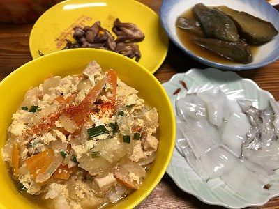 久しぶりに晩御飯をアップ冷凍室に二女彼が釣ってきた剣先イカがあったので煮物にしました。本当は、里芋と煮たいところだけど、里芋の収穫までもう少し。じゃがいもで代用です。茅乃舎のだしで煮たので上品味に仕上げるために肝はいれませんでした。まあ、剣先イカの肝はスルメイカに比べると小さいというのも理由ですが。切干大根の煮物小松菜のポン酢かけ糠漬け冷奴昨日のお昼ご飯は、回鍋肉定食とでも名付けましょうか。回鍋肉(豚肉、キャベツ、ピーマン、人参)オクラは茹でたものを乗せています。味噌汁(油揚げ、大根、人参、わかめ、豆腐)切干大根糠漬けわかめと鮭の生ふりかけ ポチッとお願いします。 iPhone X、iPhone 8、iPhone 8 Plusの発売が発表されました。欲しいけど、7を買ったばかり。それにXは、11万円だとか。高杉晋作。とても手が出ません。