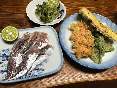 晩ご飯は、小鯵の刺身と天ぷら小鯵の刺身は、軽く塩をした後、酢洗いして皮を向いて刺身で食べます。雑味が消えて美味しい。殻付き小エビのかき揚げインゲン豆の天ぷら茄子の天ぷら胡瓜もみお昼ご飯は、有名なうどん屋へ。奥さんはイカ天うどんでイカを別盛り。(うどんに乗せない)580円。セルフ店じゃないので少し高め私は、冷やかけうどん大でした。先日、放送されたNHKの「鶴瓶の家族に乾杯」の話題に放送の中で紹介された2軒のうどん屋さんは、すごいことになっているそうです。今日行った店は、取材を断ったとか。基本的にテレビは断るそうです。常連のお客さんは「混雑して来られなくなったら困るので嬉しいけど、出てほしい気もする」とのことなるほど、常連さんならではの意見ですね。確かに1時過ぎでもしばらく待たされましたから、納得です。 ポチッとお願いします。