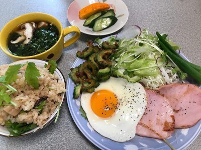 昨日は、野菜の日。8月31日で8(や)3(さ)い(1)の語呂合わせだそう。野菜たっぷりの弁当を持っていこう!と思ったけど、寝過ごしたので無理でした。炊き込みご飯とハムエッグだけど、野菜たっぷりの付け合わせにしました。炊き込みご飯は、三つ葉を大量に入れましたが、ちょっと入れすぎか?ハムは、お中元でもらったものを切って軽く炙ったハムステーキ風目玉焼きサラダ(キャベツ、レタス、赤玉ねぎ、ゴーヤスライス、貝割れ大根)茹でオクラゴーヤのおかか炒めモロヘイヤと椎茸のスープ糠漬け(胡瓜、コリンキー)所要時間17分。ちょっと頑張りました。 ポチッとお願いします。 祝 ワールドカップ出場決定!!興奮しました。