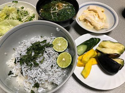 スーパーで釜揚げしらすが安くて美味しそうだったので購入釜揚げしらす丼です。青紫蘇は、ご飯としらすの間か、しらすの上に乗せるかで迷って両方に今年も酢橘の季節がやってきました。1キロの箱入りで398円と激安だったので早速購入糠漬け(三豊なす、コリンキー、胡瓜)高野豆腐の卵とじモロヘイヤのお汁サラダ ポチッとお願いします。 昨日は、久しぶりにまとまった雨が降りました。家庭菜園の野菜も喜んでいるかな?ダムの取水制限がは予定通りされるんだろうか?秋の長雨がないと冬場に水不足という事態になるかも。
