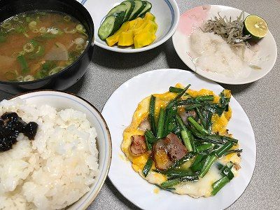 朝ごはんは、にら玉。にらとベーコンのオープンオムレツと言った方がかっこいいかな?味噌汁(大根、人参、油揚げ、ネギ)糠漬け(胡瓜、コリンキー)ちりめんおろしと酢橘(余った果汁は、味噌汁にも搾った)海苔の佃煮 ポチッとお願いします。 今日はゆっくり目に朝6時から1時間のスロージョギング。洗濯をして干して、朝ごはん食べて・・・貧乏暇なしです。