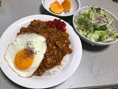 いつも悩むのが、これがキーマカレーか、ドライカレーかということ。今回は、鶏ミンチを使うことを目的に作ったので、キーマカレーということにしとこう。具は、鶏ミンチと玉ねぎ、ピーマン、人参をみじん切りにして炒める。ナツメグ、コリアンダー、ターメリック、ガラムマサラ、塩胡椒を加えてさらに炒める。野菜ジュース、ケチャップ、水を入れて煮込み、カレールーを入れます。(クミンを切らしていた)半熟目玉焼きサラダ(キャベツ、レタス、赤玉ねぎ、胡瓜、カイワレ大根)柿 ポチッとお願いします。 しかし、雨がやみません。というか、これから台風が接近してくるのでもっと降るんでしょうが。NARUTOに出てくる雨隠れの里かよ!と言いたくなります。(知っている人しかわからない・・)香川は、年間で1ミリ以上の雨が降る日が100日ありません。朝起きたら、地面が濡れていて、夜中に雨降ったんだと思う日もあり実感としては50日も降らないかもなので、この1週間も続く雨は珍しい。子供のころの梅雨は、こんな感じで毎日降っていましたが、最近は空梅雨ばかりですから。台風の針路にあたる方はお気を付けください。どうかどこにも被害が起きませんように。