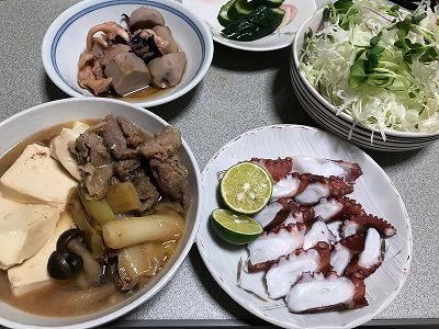 そう、最初は肉豆腐のつもりでした。「あ、しめじがある」と入れたら、ネギも入っているのですき焼き風になってしまいました。そもそも、このメニューを思いついたのは、近所のスーパーで「よかったらネギどうぞ」とタダで太ネギ3本をもらったのから。牛肉と一緒に甘辛く煮ると美味しいだろう。考えてみるとその時点で肉豆腐じゃなくてすき焼きですね。イカと里芋の煮物タコの刺身(酢橘を搾った醤油で。香りが最高)サラダ(キャベツ、レタス、貝割れ、赤玉ねぎ)糠漬け ポチッとお願いします。 ブロッコリーの話先週の水曜日の夜、長女彼からLINEが入りました。「〇〇です。ブロッコリーの苗が余ったので捨てるのも何なので、お父さんいりますか?」うちは、種まきしたブロッコリーの出来が悪いので困っていたので「いります」と返事翌日、長女彼がブロッコリーの苗を持ってきてくれました。その数なんと300本!!整地が終わっていないので植える場所がないし、そのそもそんなに食べられない!うちも誰かに差し上げることになりそうです。