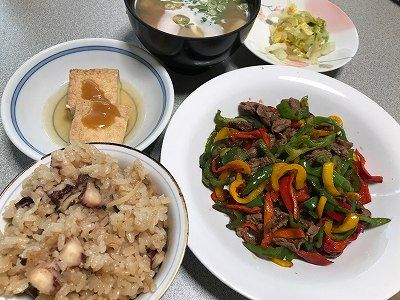 実家からもらってきた茹でタコ。そろそろ食べきらなきゃとたこ飯にしました。新生姜もたっぷり入れているので風味抜群チンジャオロースは、普通のピーマン以外に黄色のパプリカと赤ピーマンも加えています。味付けは、オイスターソース、牡蠣醤油、味醂、砂糖、塩胡椒絹厚揚げの煮物味噌汁(里芋、油揚げ、大根、人参、かきの木茸)白菜の浅漬け(近所のスーパーで無料でもらった。ここは時々、ネギとかキャベツ、レタスなどをくれる) ポチッとお願いします。 今日のにゃんこ写真は、台所の椅子の上に敷いた座布団でくつろぐあんこここが彼の定位置のひとつです。たぷたぷのお腹も可愛らしく見える不思議このところ、忙しくて訪問んが滞っております。ご容赦ください。今月終わりには少しは落ち着くかな。