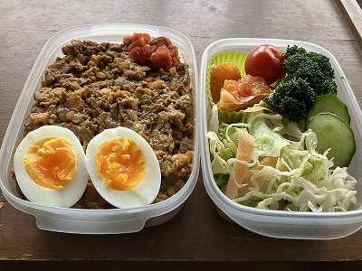 合い挽き肉でドライカレー弁当を作りました。合い挽き肉、人参、玉ねぎ、ニンニク、クミン、ナツメグを炒めます。水、ケチャップを入れて少し煮込んでカレールーで味付けゆで卵サラダ(キャベツ、レタス、人参、胡瓜、ブロッコリー、ミニトマト)みかん ポチッとお願いします。 久しぶりに恵みの雨でした。夏野菜も喜んでいるかな。今年は、スナップエンドウが収穫出来そうにありません。毎年、種を取って植えているのですが、どうやら他の物と交雑したようで皮が硬い。来年からは種を買おう。
