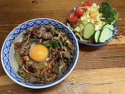 イチビキの石焼風ビビンバの素が残っていたので牛肉と炒めてご飯に乗せました。ニラがあったので一緒に炒めたらこれが正解前回、黄身だけ乗せようとしたら割れたので、今回は全卵です。サラダ(キャベツ、レタス、人参、胡瓜、ミニトマト、ブロッコリー) ポチッとお願いします。