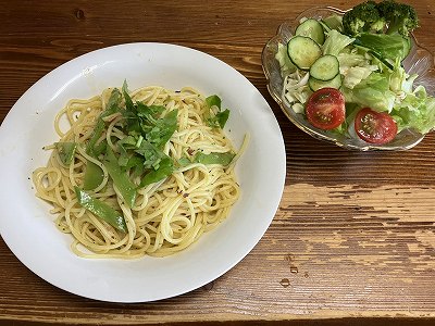 世間は祭日で休みだけど、仕事です。まあ、有休を取って4連休で2日間お遍路に行ったので文句は言えないか。ペペロンチーノです。味付けは、塩、黒胡椒、白だしですし、オランダエンドウと三つ葉をトッピングしたので和風の感じサラダ(キャベツ、レタス、胡瓜、ミニトマト、ブロッコリー) ポチッとお願いします。