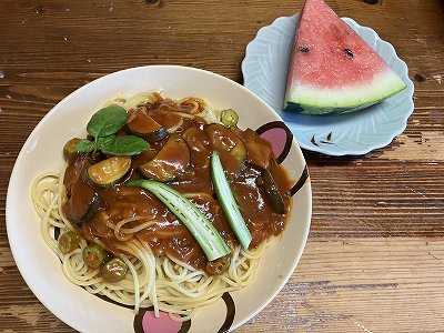 市販のミートソースに家庭菜園の茄子を焼いたものとオクラを入れました。茄子がトロトロでうまし。バジルとオクラをトッピング今年は家庭菜園のスイカがいい感じに育っています。ポチッとお願いします。