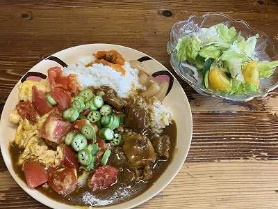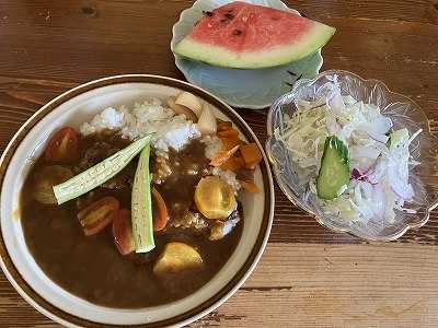 カレーライスにミニトマトを入れて、オクラをトッピングサラダ(キャベツ、レタス、赤玉ねぎ、胡瓜)スイカポチッとお願いします。 前にも書いたかもですが、今年はスイカ栽培がうまくいきました。2本植えたのですが、1個目の小ぶりなもののあと、大きなものが4個。まだ小さいものが4個なっています。YouTubeの農業動画で栽培方法や収穫時期の見極めを見たのもよかったかな。