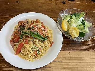 家庭菜園のトマトが沢山あるので、フレッシュトマトのスパゲッティを作りました。にんにく、唐辛子、ベーコンを炒め、ざく切りのトマト、スパゲッティのゆで汁を入れて煮ます。硬めに茹でたスパゲッティを入れて、塩胡椒で味を調え、ざく切りのバジルを混ぜます。サラダ(レタス、胡瓜、ミニトマト)美味しかった。美味しかったけど、この猛暑の昼に火を使って唐辛子が効いたものを食べるのはダメですですね。汗が止まらないこと、止まらないこと。止まらないこと。ポチッとお願いします。 昨日は、職場関係の飲み会でした。色んな話が出来て楽しかった。