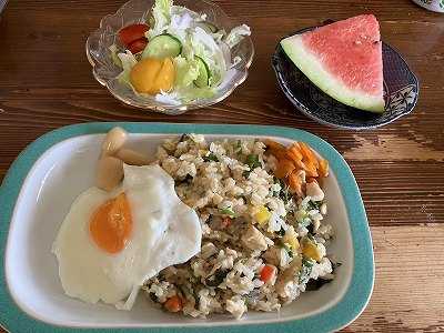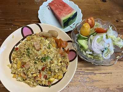 久しぶりに炒飯を作りました。炒飯の素を使うつもりだったけど、家庭菜園の野菜を使いたくて素は使わず。炒り卵、ピーマン、人参、玉ねぎ、豚こま、福神漬け福神漬けを入れたのが少し新しいかな。サラダ(キャベツ、赤玉ねぎ、胡瓜、トマト)ポチッとお願いします。
