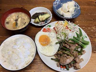 レトルトカレーに焼いた茄子を入れ、目玉焼きをトッピングしました。オクラ、らっきょう、福神漬けサラダ(キャベツ、ピーマン、ゴーヤ)ポチッとお願いします。 ボクシングの井上尚弥選手は圧勝でした。アウトボクシングも出来るんだ。田中将大選手は、200勝できませんでしたが、6回まで投げて2失点。5回までは0点だったので次回は期待できるかな。味方の援護が欲しいですね。