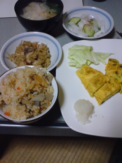 山菜炊き込み、切り干し大根煮、大根とキュウリのサラダ、大根と麩の味噌汁。