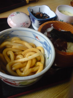 何でもたまり醤油を絡めて食べるので柔らかい方がいいとか、多数の参拝客に提供するために太めの麺をずっと茹で続けているとか。